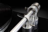 The 7 pound (3.18 kg) machined aluminum platter resides on the top of the unit. This and the matching machined aluminum tonearm with anti-skate sit atop a 3/8” (9.5mm) thick piece of glass – the same glass found in the front panels of our larger amplifiers; this in turn sits atop a custom 1/4” (6.35mm) thick metal plate that adds stability. The combined heftiness of both the platter and metal plate helps resist and absorb noise that could be caused by external vibrations.